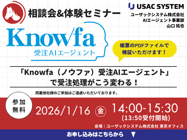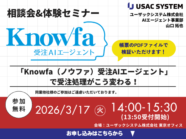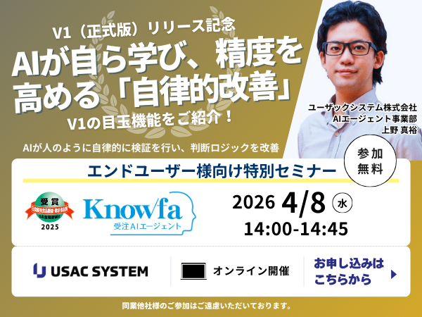- 2026.02.04 【製造&卸業界のDXを加速】受注業務の「職人芸」をAIが継承。自律学習機能を搭載した「Knowfa 受注AIエージェント V1」を3月にリリース