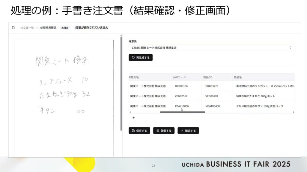 ◦ 文字化された注文書の情報を理解し、基幹システムに必要なデータに補正します。