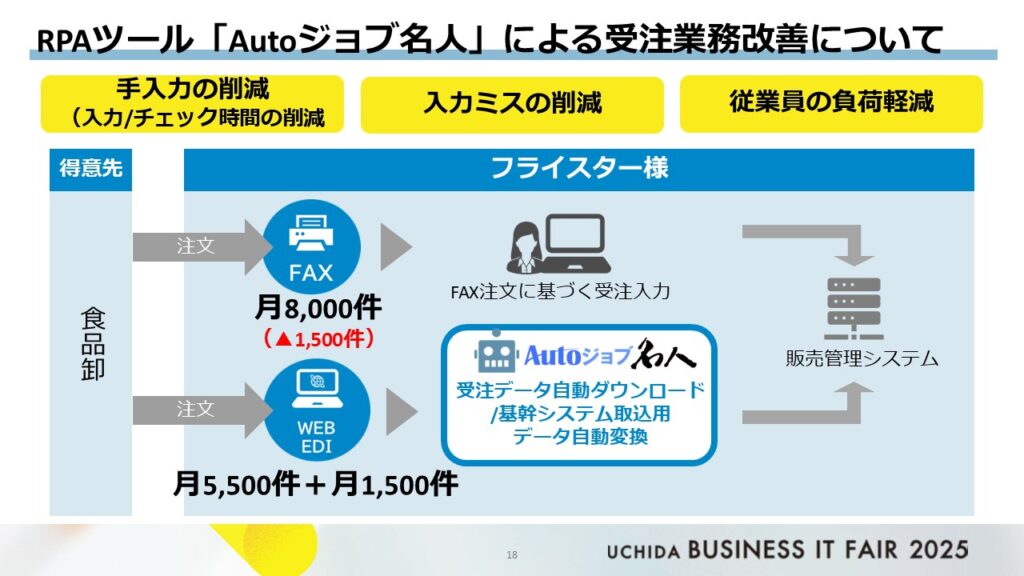 2. STEP2: EDI比率増加に加え、RPAツール「Autoジョブ名人」を導入。RPAの導入により、手入力の削減(FAX注文の一部自動入力やチェック時間の削減)、入力ミスの削減、従業員の負担軽減といった効果を上げていました。