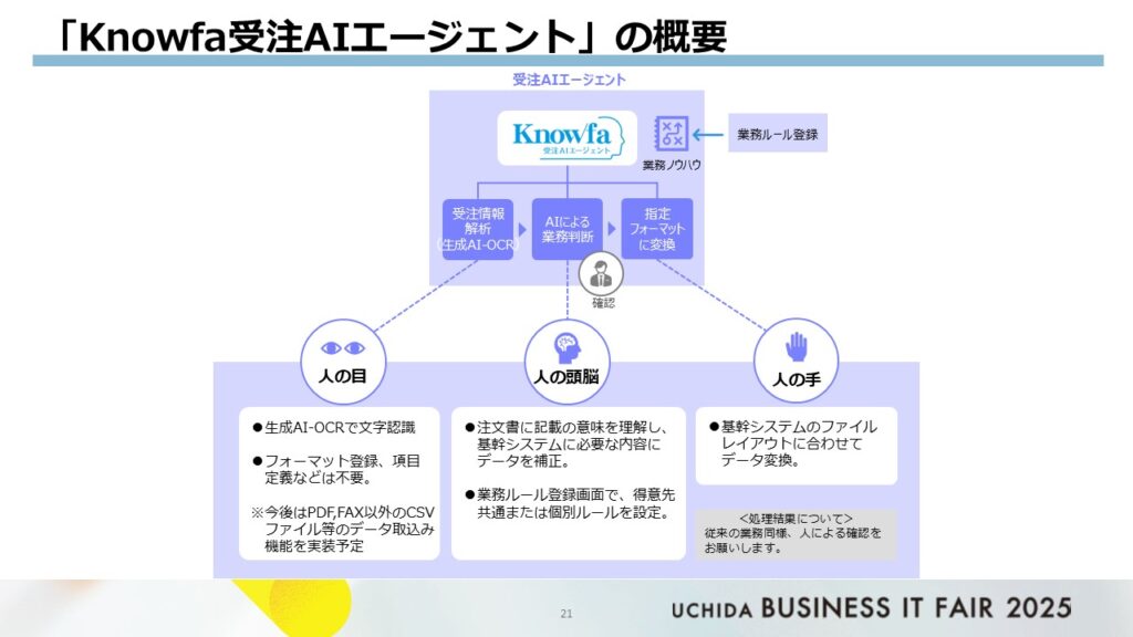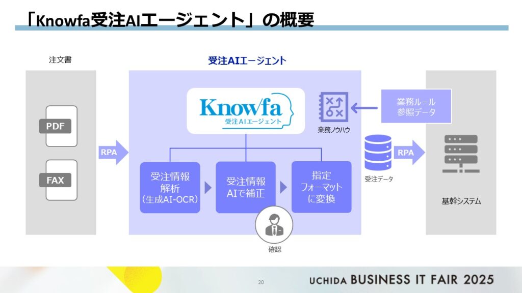こうしたRPAだけでは解決できない課題が残る中で、「手入力受注“ゼロ”」を目指し、人が判断しなければならないイレギュラーな業務にも対応できる次世代のソリューションとして、「Knowfa 受注AIエージェント」の採用を検討するに至りました。
