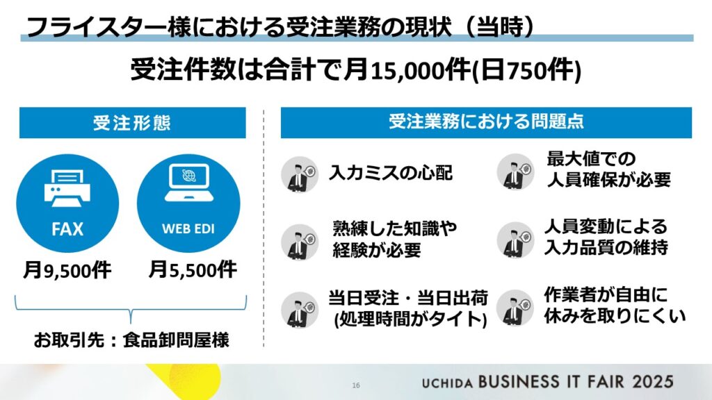 当時の受注件数は合計で月15,000件(日750件)月9,500件がFAXによる注文でした(取引先は主に食品卸問屋)。